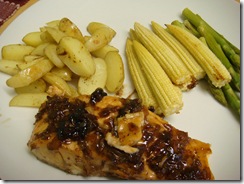 Baked Salmon glazed with Honey, Shallots, Garlic and Balsamic Vinegar. Sides: Baked potatoes, baby corn and asparagus.